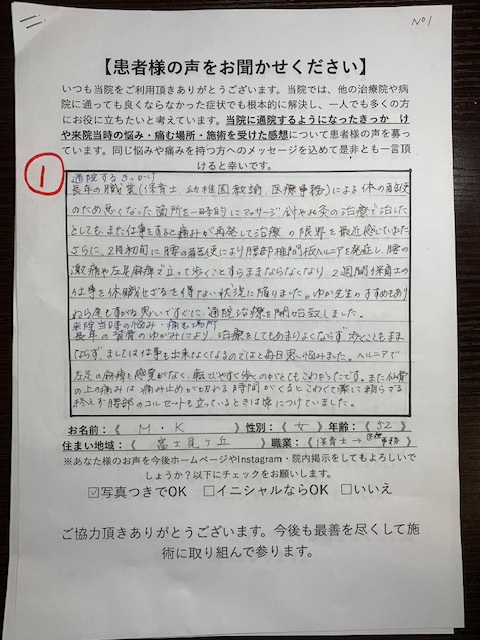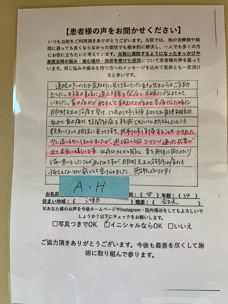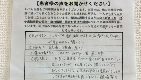 新聞の折り込みを見て伺い問診と施術をして頂き辛い症状を沢山訴えても優しく明るく耳を傾けてくれて、とても嬉しく先生にお願いしようと思い、今1週間に1度のペースでお世話になっています。