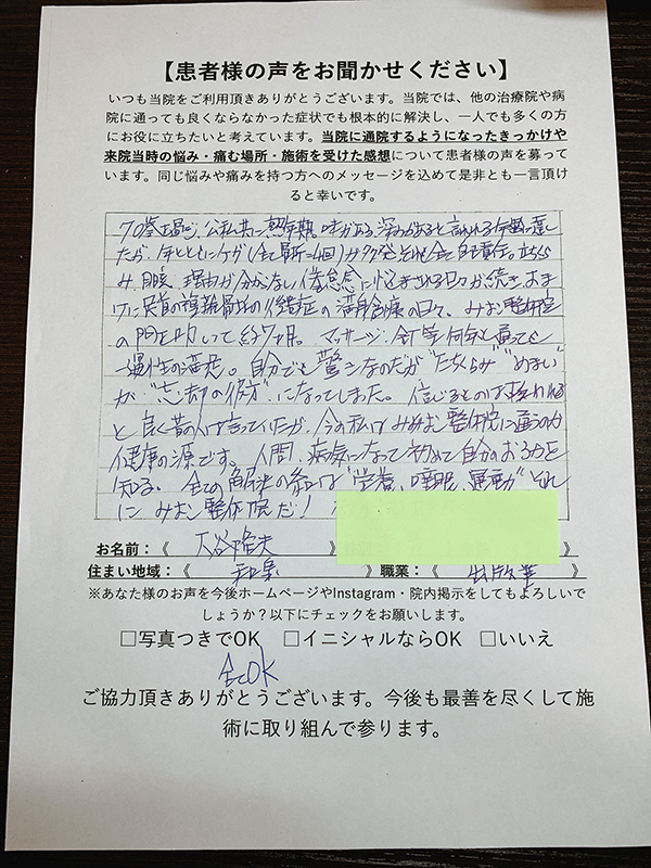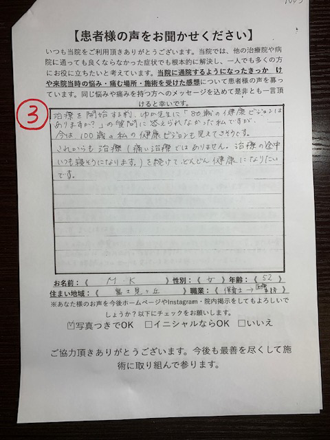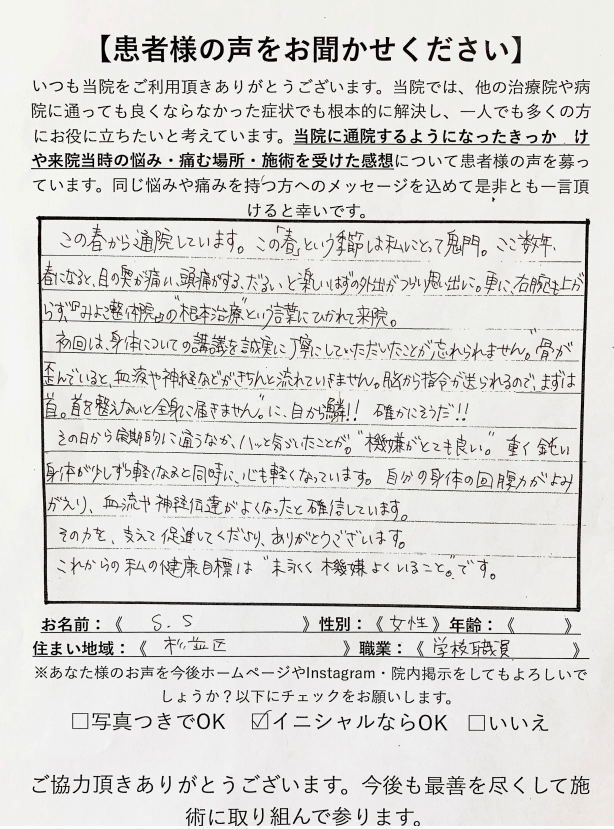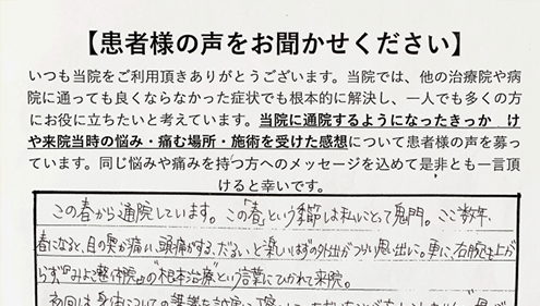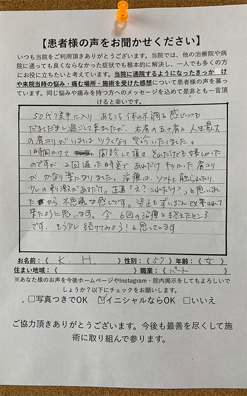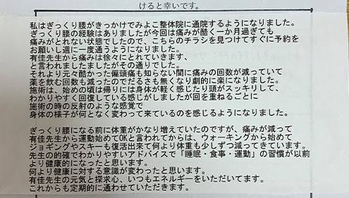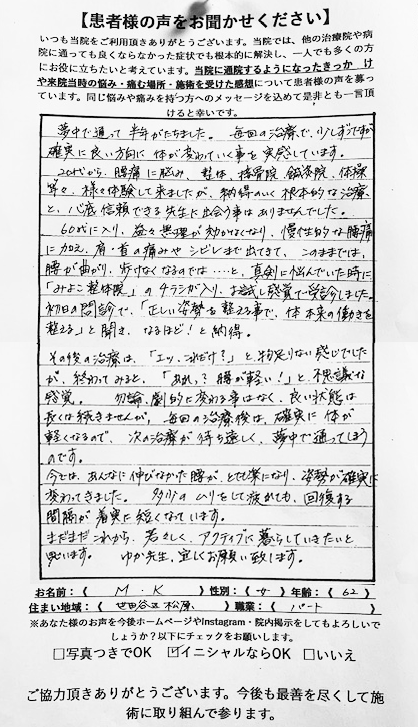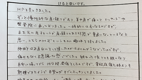 施術では、いつも明るい先生にお会いするのが楽しみで、元気をもらいました。