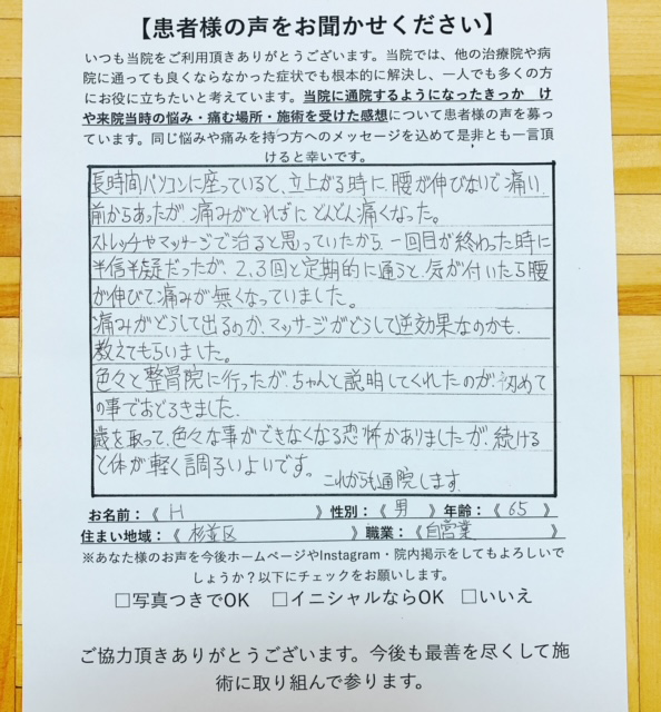 その後の治療は、「エッ!これだけ?」と物足りない感じでしたが、終わってみると「あれっ?腰が軽い!」と不思議な感覚。