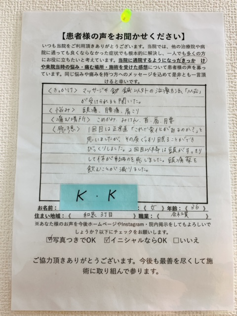 正直ところM式という治療を初めて体験し、1回目の治療では効果がわかりませんでしたが、3~5回通う頃から腕の可動域が広がり、その頃から寝るときの肩の痛みが軽減され不眠に悩んでいましたが眠れるようになりました。通院して4ヶ月の現在はビックリするぐらい生活が激変!!