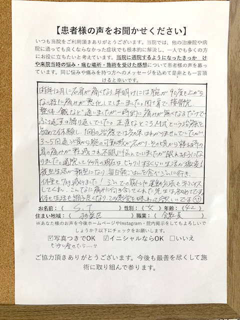 四十肩で接骨院や整体・鍼などに通いましたが、一時的に痛みが無くなるだけでぶり返すの繰り返しでした。