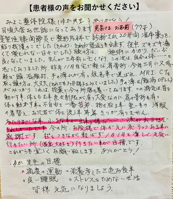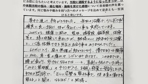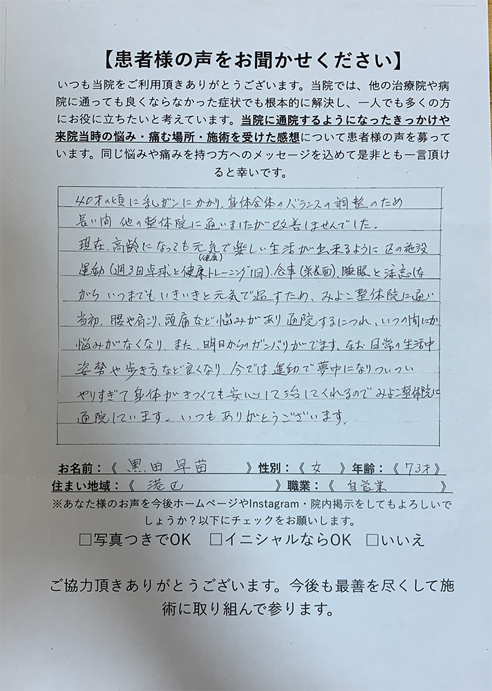 なお日常の生活中姿勢や歩き方など良くなり今では運動で夢中になりついついやりすぎて身体がきつくても安心して治してくれるのでみよこ整体院に通院しています。いつもありがとうございます。