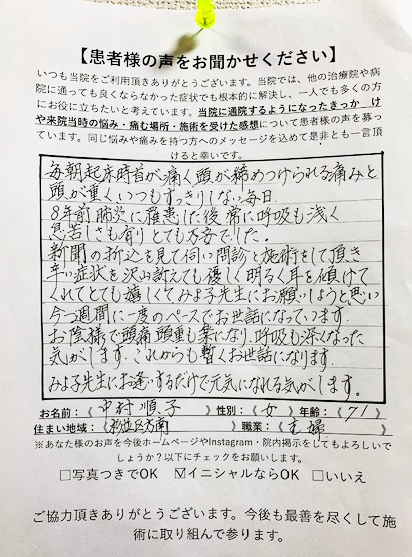 お陰様で、頭痛・頭重も楽になり呼吸も深くなった気がします。