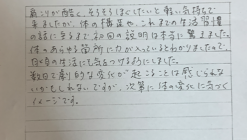 初診の問診で「正しい姿勢を整えることで、体本来の働きを整える」と聞き、なるほど!と納得。