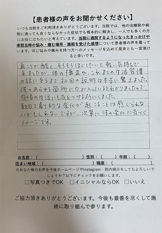 患者様自身がその原因を知ることで自身の身体をより深く理解し、安心して施術を受けることができると考えております。