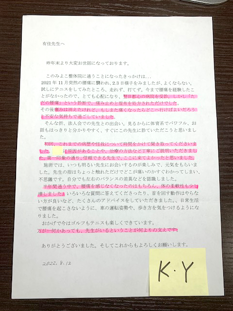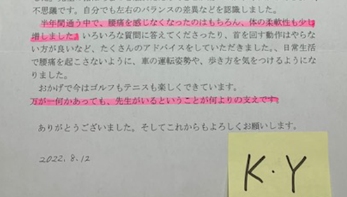 2021年2月以降、全ての骨格障害の原因である、「姿勢矯正」に集中しM式テクニックによる毎週1回のペースで治療を受けているが、有佳先生への全幅の信頼の証であり、調子の良さが続いています。今は妻も毎週有佳先生にお世話になり、ゴルフ好きからくる腰痛が大幅に改善したと喜んでいます。